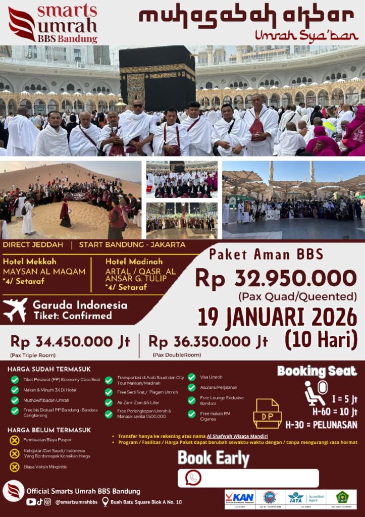 Tunaikan ibadah suci di awal tahun dengan Paket Umroh Sya’ban Muhasabah Akbar 19 Januari 2026 – 10 Hari bersama Smarts Umroh BBS Bandung. Perjalanan Anda akan ditemani kenyamanan maskapai Garuda Indonesia, dengan akomodasi nyaman dan layanan profesional. Wujudkan umroh impian Anda dengan pengalaman spiritual yang tenang, khusyuk, dan penuh berkah di tanah suci.